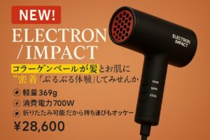 本製品は、エレクトロンインパクト独自の技術を搭載し、髪の内部に必要な潤いを保ちながら、優しい温風で効率よく乾かすことができる高機能ドライヤーです。